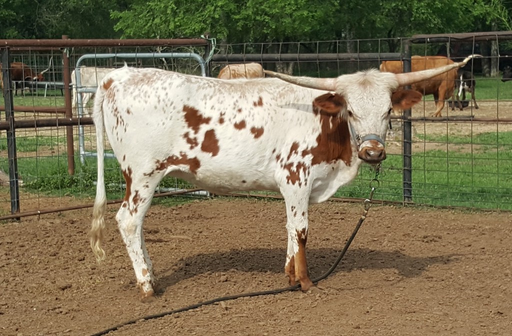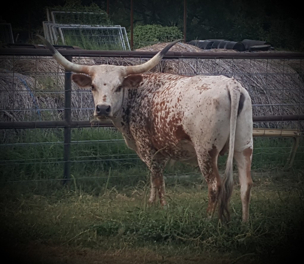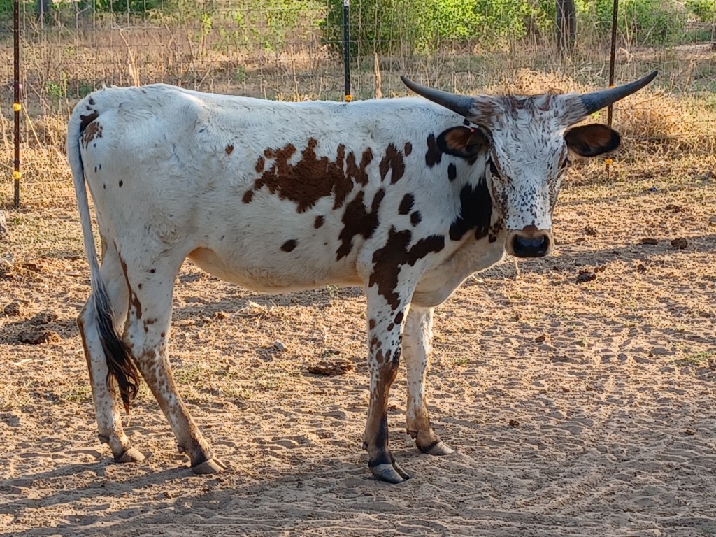 Monopoly x Jesse James . She will eventually have spots like her dam Monopoly. She already has spots on her legs, back and the tip of her tail. Heavy Butler influence in her breeding. She is bred for her first calf in April 2023.