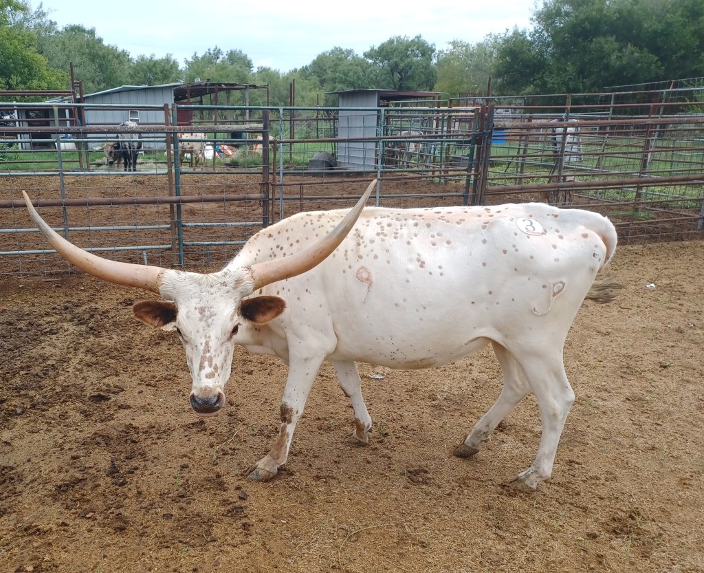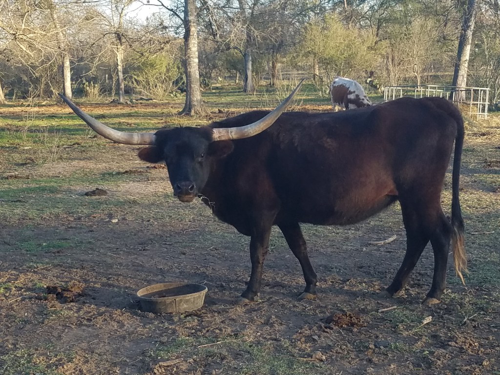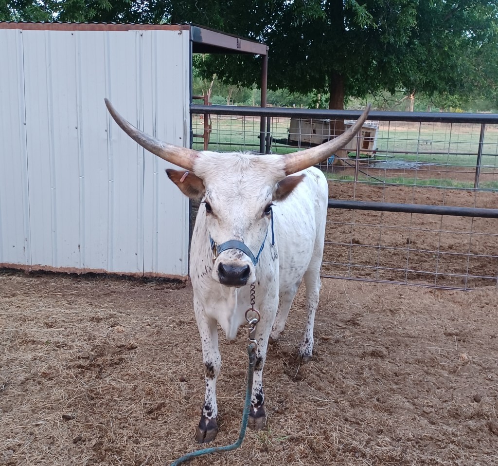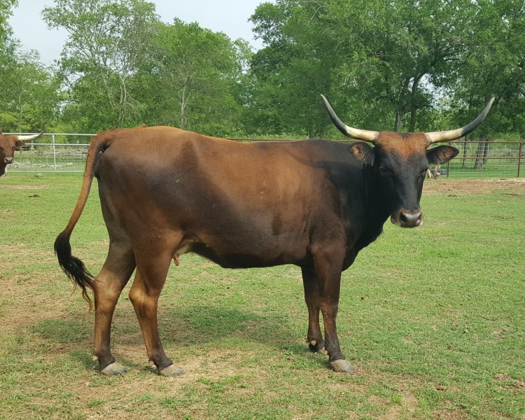 Her Grandsire is Peacemaker 44. Flare is small and colorful with very twisty horns. She measures 44.75″ at the hip.