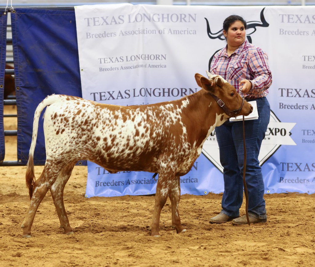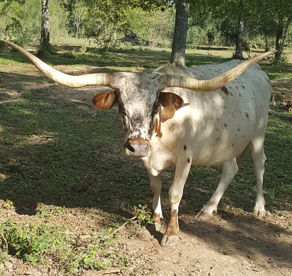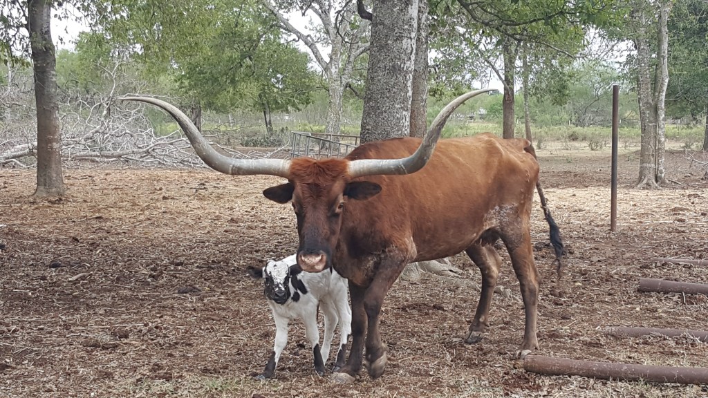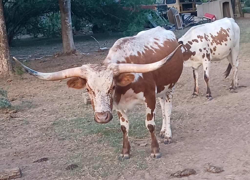 Her Grandsire is Peacemaker 44. Flare is small and colorful with very twisty horns. She measures 44.75″ at the hip.